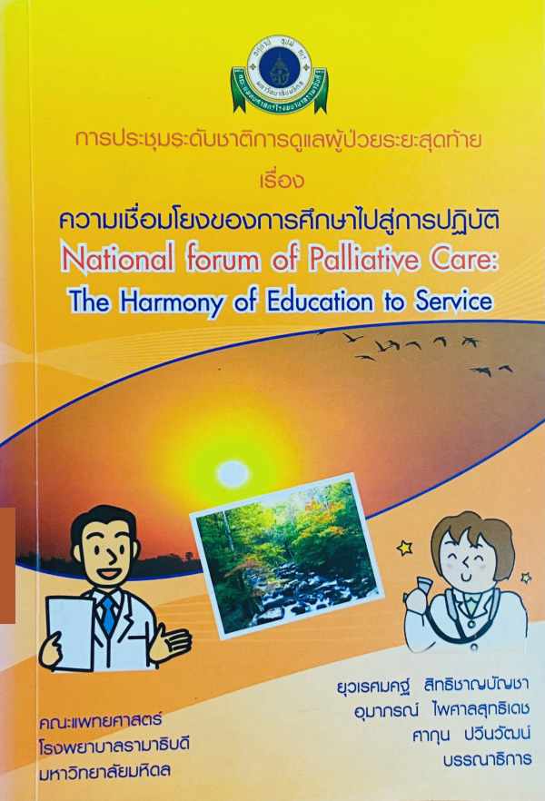 การประชุมระดับชาติการดูแลผู้ป่วยระยะสุดท้ายเรื่อง ความเชื่อมโยงของการศึกษาไปสู่การปฏิบัติ = National forum of palliative care : The harmony of education to service บรรนาธิการโดยยุวเรศมคฐ์ สิทธิชาญบัญชา, อุมาภรณ์ ไพศาลสุทธิเดช, ศากุน ปวีนวัฒน์, บรรณาธิการ