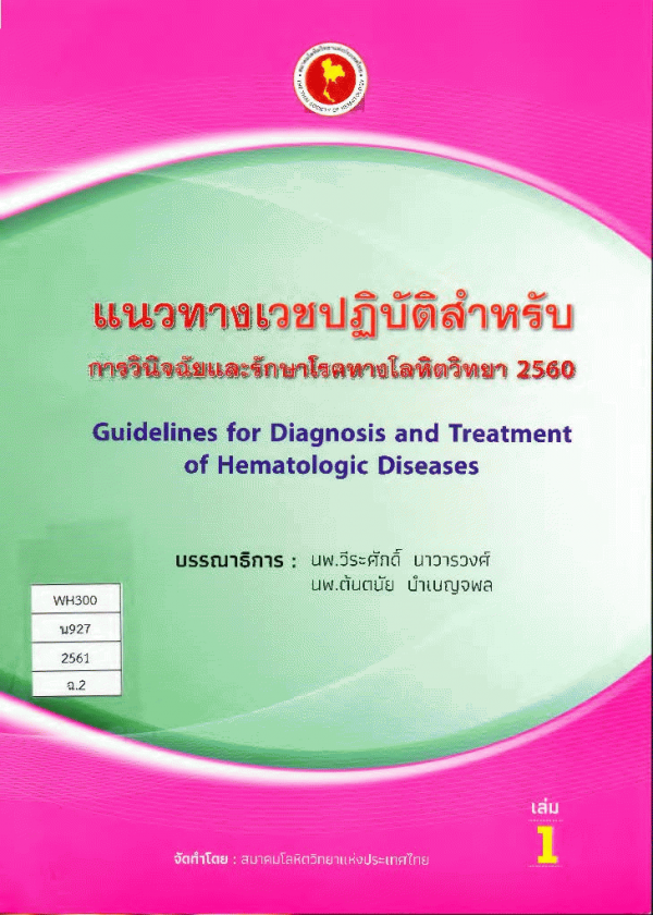 แนวทางเวชปฏิบัติสำหรับการวินิจฉัยและรักษาโรคทางโลหิตวิทยา 2560 เล่ม 1 : Guidelines for Diagnosis and treatment of Hematologic Diseases/ บรรณาธิการ, วีระศักดิ์ นาวารวงศ์,ต้นตนัย นำเบญจพล