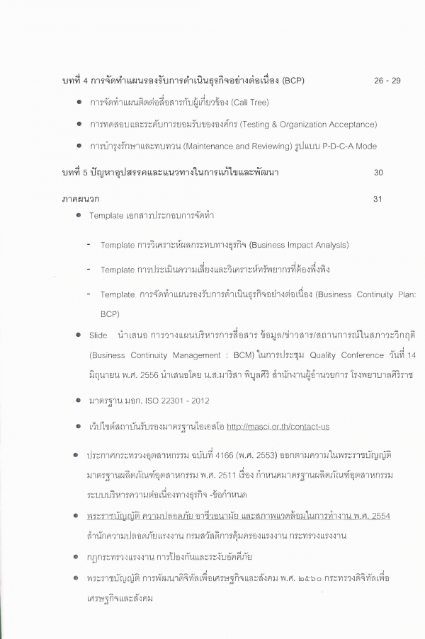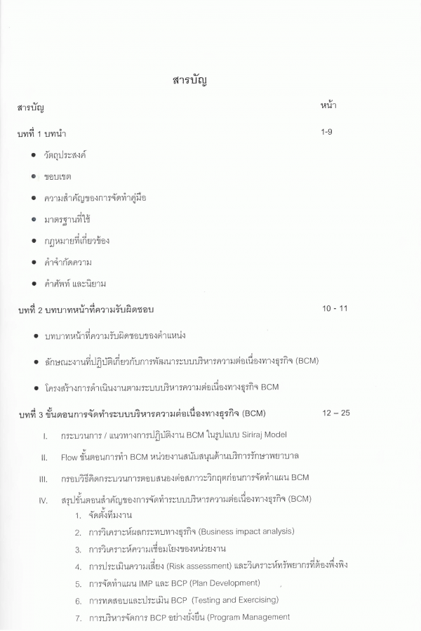 คู่มือการจัดทำระบบบริหารความต่อเนื่องทางธุรกิจ(Business Continuity Management:BCM) ด้านสนับสนุนบริการรักษาพยาบาลในรูปแบบ Siriraj Model/ มาริสา พิบูลศิริ.