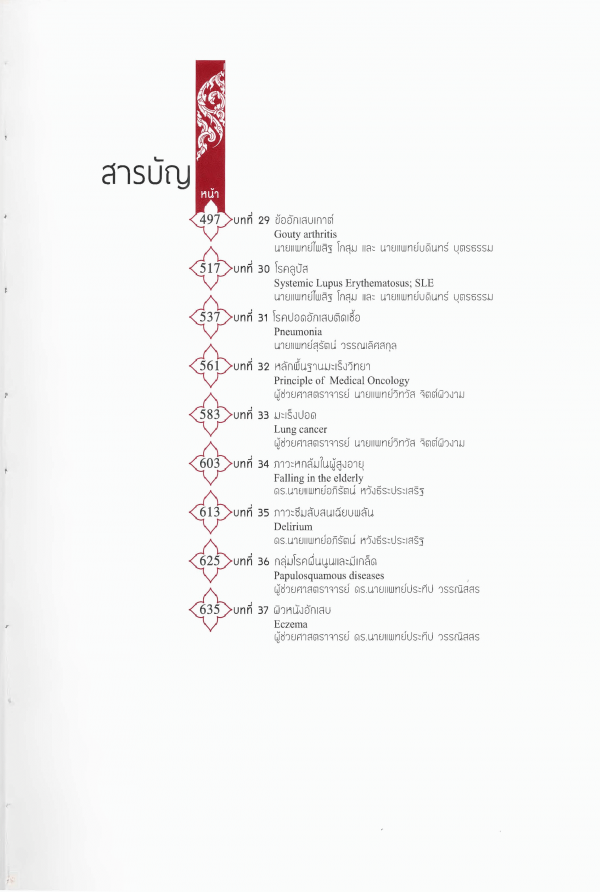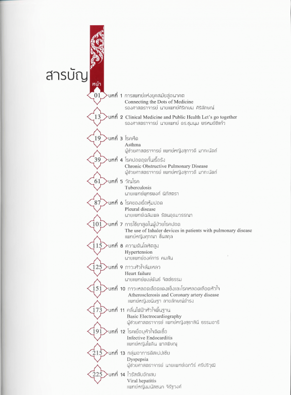การแพทย์แห่งยุคสมัยสู่อนาคต -- Clinical medicine and public health let's go together -- โรคหืด -- โรคปอดอุดกั้นเรื้อรัง -- วัณโรค -- โรคของเยื่อหุ้มปอด -- การใช้ยาสูดในผู้ป่วยโรคปอด -- ความดันโลหิตสูง -- ภาวะหัวใจล้มเหลว -- ภาวะหลอดเลือดแดงแข็งและโรคหลอดเลือดหัวใจ -- คลื่นไฟฟ้าหัวใจพื้นฐาน -- โรคเยื่อบุหัวใจติดเชื้อ -- กลุ่มอาการดิสเปปเซีย -- ไวรัสตับอักเสบ -- ตับแข็ง -- ภาวะไตวายเฉียบพลัน -- ความผิดปกติของสมดุลกรด-ด่าง -- ความผิดปกติของสมดุลโพแทสเซียม -- ภาวะโซเดียมต่ำ -- การดูแลผู้ป่วยโรคเบาหวาน -- ภาวะไทรอยด์เป็นพิษ -- อ้วนลงพุง -- มะเร็งทางโลหิตวิทยา -- การให้ส่วนประกอบของเลือด -- มะเร็งเม็ดเลือดขาวชนิดเฉียบพลัน -- โรคติดเชื้อของระบบประสาทส่วนกลาง -- โรคหลอดเลือดสมองตีบและอุดตัน -- อาการชักและโรคลมชัก -- ข้ออักเสบเกาต์ -- โรคลูปัส -- โรคปลอดอักเสบติดเชื้อ -- หลักพื้นฐานมะเร็งวิทยา -- มะเร็งปอด -- ภาวะหกล้มในผู้สูงอายุ -- ภาวะซึมสับสนเฉียบพลัน -- กลุ่มโรคผื่นนูนและมีเกล็ด -- ผิวหนังอักเสบ