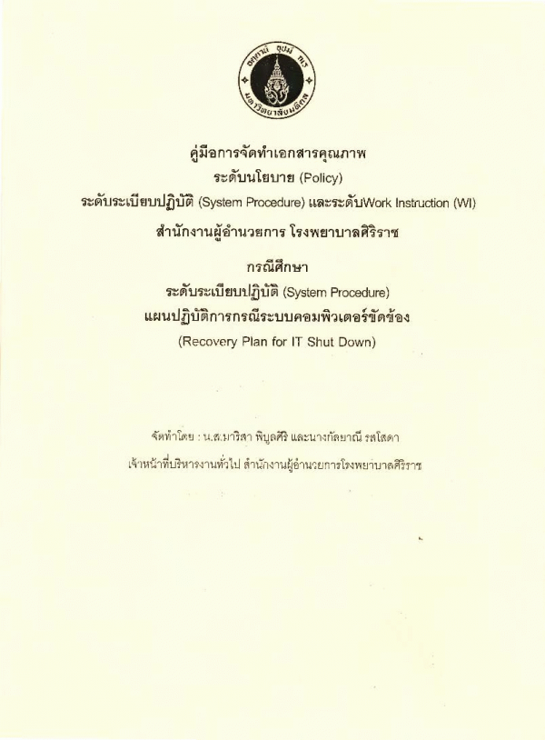 คู่มือการจัดทำเอกสารคุณภาพ ระดับนโยบาย (Policy) ระดับระเบียบปฏิบัติ (System Procedure)และระดับWork Instruction(WI) สำนักงานผู้อำนวยการโรงพยาบาลศิริราช: กรณีสึกษา ระดับระเบียบปฏิบัติ ( System Procedure) แผนปฏิบัติการกรณีระบบคอมพิวเตอร์ขัดข้อง(Recovery Plan for IT Shut Down)/ มาริสา พิบูลศิริ และกัลยาณี รสโสดา.