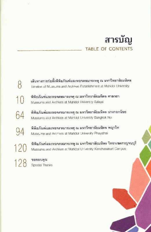 พิพิธภัณฑ์และหอจดหมายเหตุ ณ มหาวิทยาลัยมหิดล = Museums and archives at Mahidol University / ฝ่ายหอจดหมายเหตุและพิพิธภัณฑ์ หอสมุดและคลังความรู้มหาวิทยาลัยมหิดล.