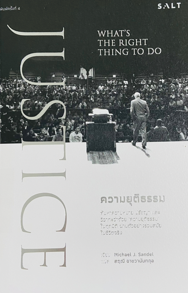 การทำสิ่งที่ถูกต้อง --- หลักความสุขสูงสุด/อรรถประโยชน์นิยม --- เราเป็นเจ้าของตัวเองหรือเปล่า/ลัทธิอิสรนิยม --- ลูกจ้าง/ตลาดและศีลธรรม --- สิ่งสำคัญคือเจตนา/อิมมานูเอล คานท์ --- ข้อสนับสนุนความเท่าเทียม/จอห์น รอลส์ --- ถกเถียงเรื่องระบบโควตา --- ใครคู่ควรกับอะไร/อริสโตเติล --- เราเป็นหนี้บุญคุณกันเรื่องอะไร/ความย้อนแย้งเรื่องความจงรักภักดี --- ความยุติธรรมและความดีสาธารณะ.