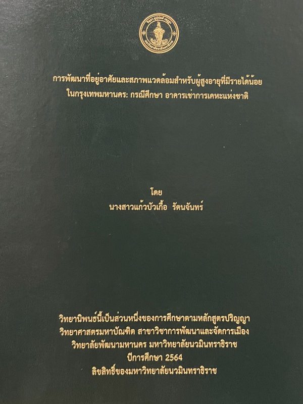 การพัฒนาที่อยู่อาศัยและสภาพแวดล้อมสําหรับผู้สูงอายุที่มีรายได้น้อยในกรุงเทพมหานคร : กรณีศึกษาอาคารเช่าการเคหะแห่งชาติ = HOUSING AND ENVIRONMENT DEVELOPMENT FOR THE LOW INCOME ELDERLY IN BANGKOK : A CASE STUDY ON RENTAL HOUSING OF NATIONAL HOUSING AUTHORITY